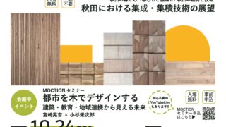 お知らせ MOCTION AKITA 2025 開催します! 県産材のブランド力の強化を図るため、木材製品のプロモーションを展開します。 令和5年度から開催しており、テーマは継続して「AKITA Wood Mania!~マニアックなほど素晴らしい秋田の木と仕事~」。 今回は、一般的な内装材等における「... 2025.10.20 お知らせ